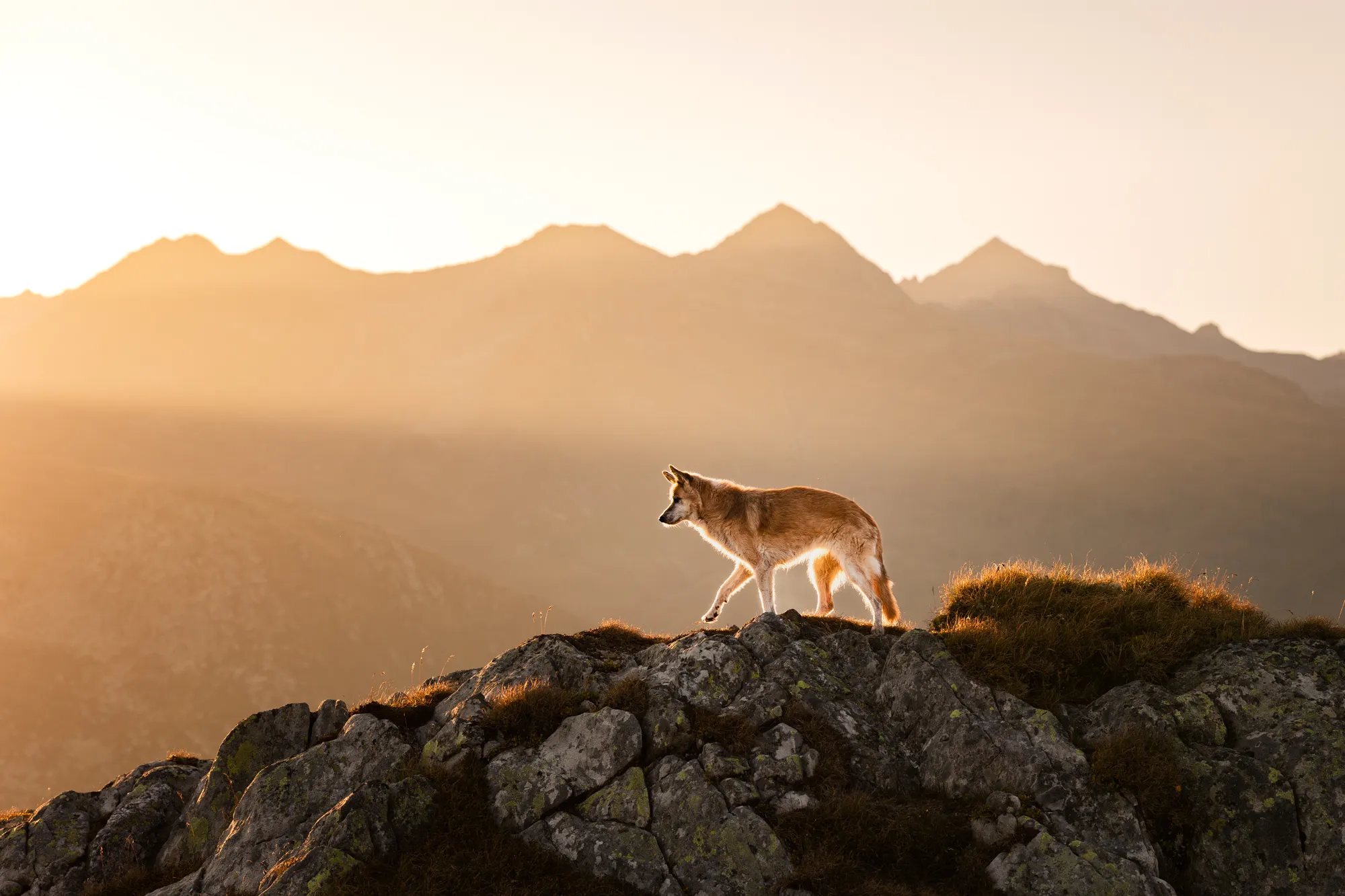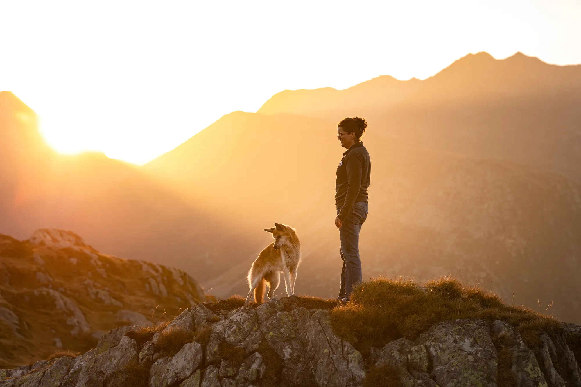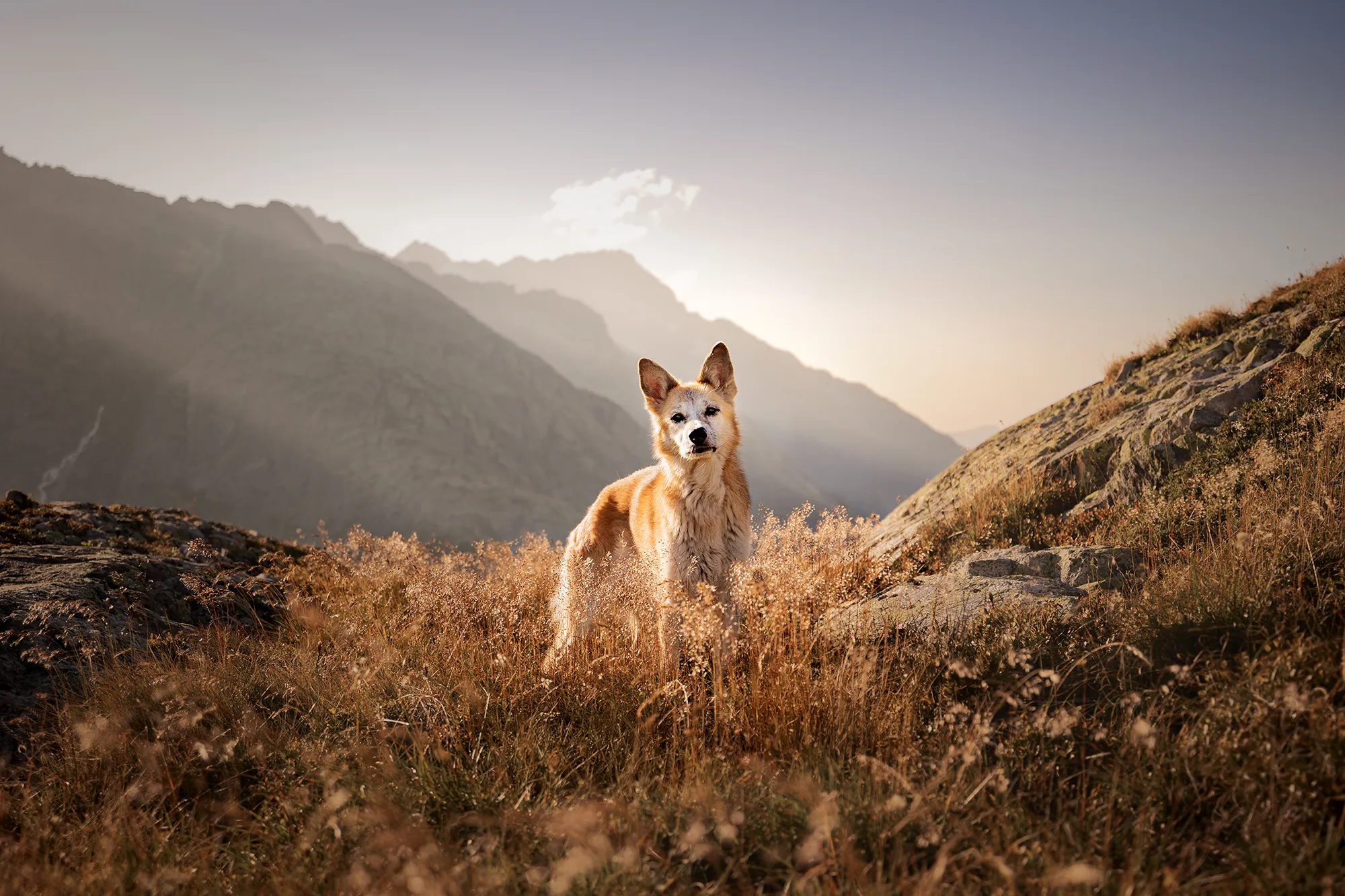 Der Sonnenuntergang brannte sich über die Bergkämme. Warmes Licht, klare Konturen, eine Weite, die man nicht erklären muss. Während wir uns langsam Richtung Spot bewegten, blieb das Tempo niedrig. Kein Stress, kein Drängen. Genau das ist entscheidend: Hundefotografie in den Bergen muss sich am Hund orientieren, nicht am Plan.